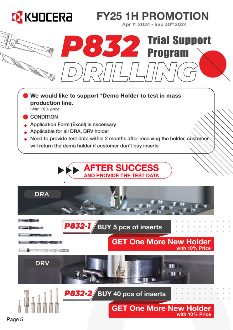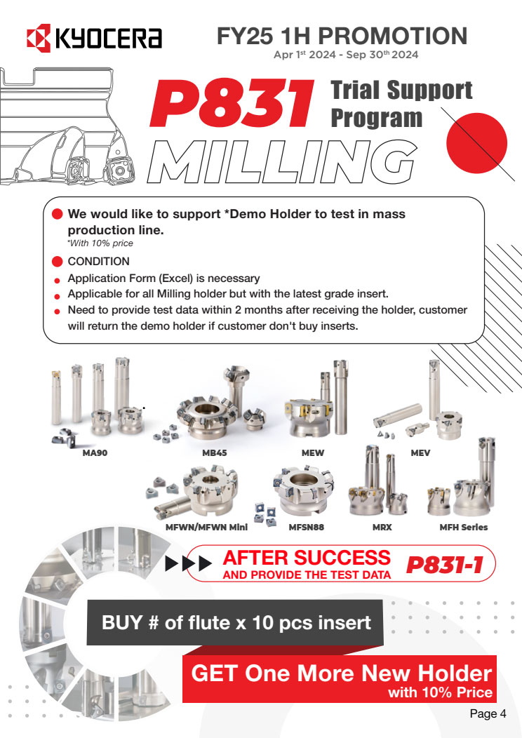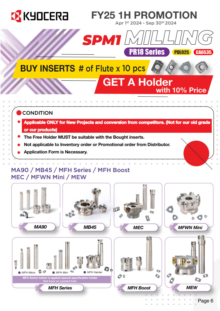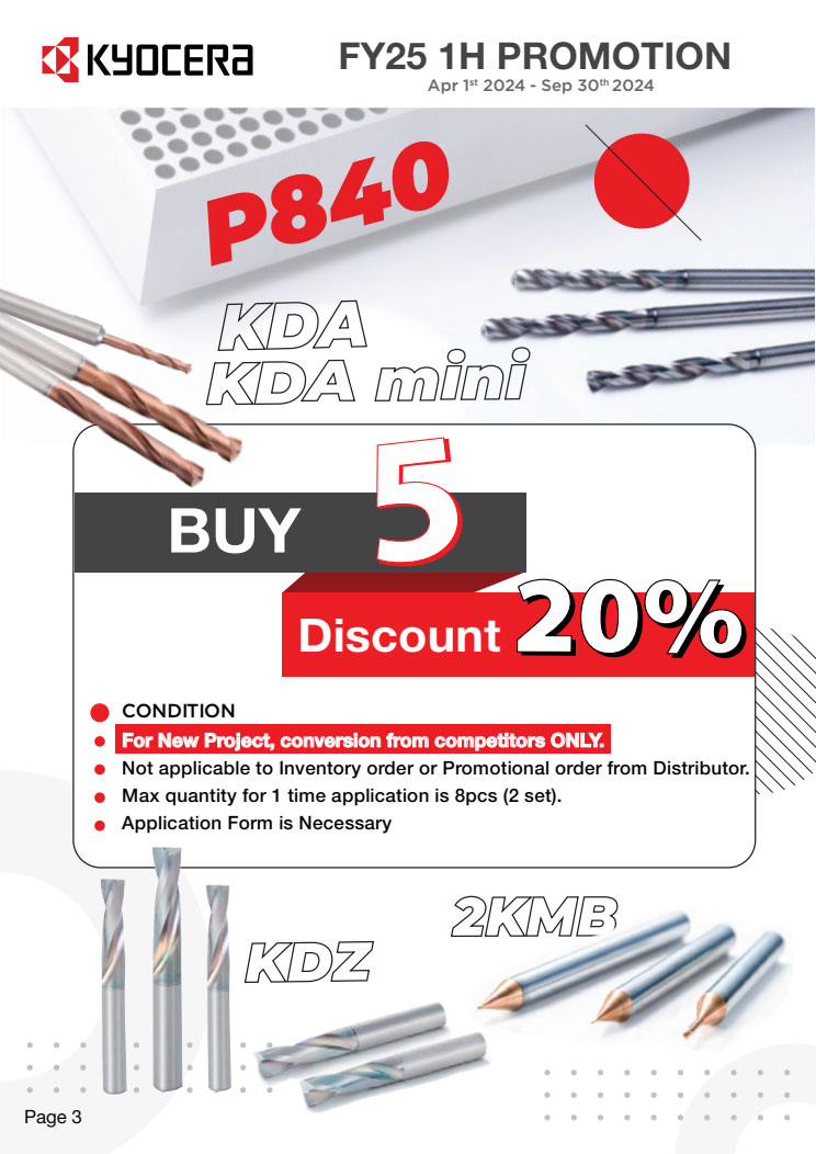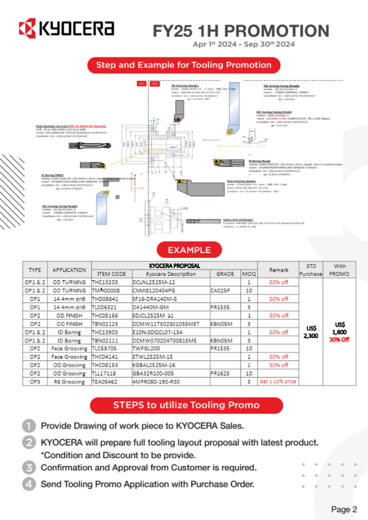 Khuyến mãi cho các dự án mới khi set up gia công sản phẩm mới, chi tiết mới. Hutscom cùng Kyocera hỗ trợ thiết kế tool layout phù hợp với bộ tool của Kyocera. Chỉ cần mua số lượng Insert theo yêu cầu, bạn sẽ được giảm 50% toàn bộ Holder đi kèm. Đối với Solid tool, mua 2 sản phẩm cùng loại thì được giảm 90% sản phẩm thứ 3 cùng loại