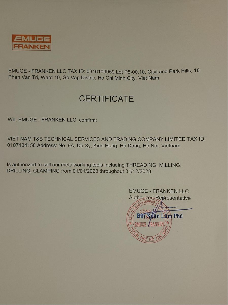 CÔNG TY TNHH THƯƠNG MẠI VÀ DỊCH VỤ KỸ THUẬT T&B VIỆT NAM là đại lý Thương hiệu Emuge Franken tại thị trường Việt Nam , chúng tôi cam kết mang đến cho khách hàng những giải pháp tối ưu, sản phẩm chất lượng, giá cả cạnh tranh và thời gian giao hàng nhanh nhất.