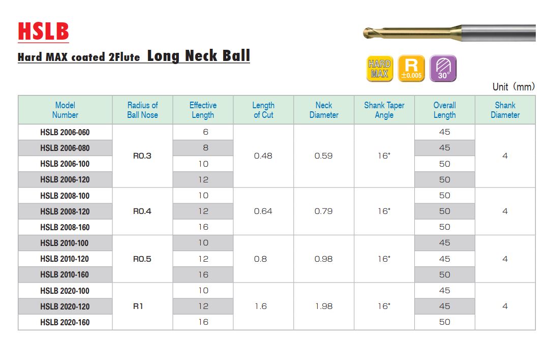 Các sản phẩm bao gồm dao phay ngón hình xuyến và mũi bi cacbua rắn có dung sai bán kính lên đến +/- 0,005 mm và dung sai đường kính 0,01 mm. Dao cắt mũi bi có các đường kính cắt từ 0,4 đến 6 mm. Dao phay ngón Torus có sẵn với đường kính cắt 3 và 4 mm.
