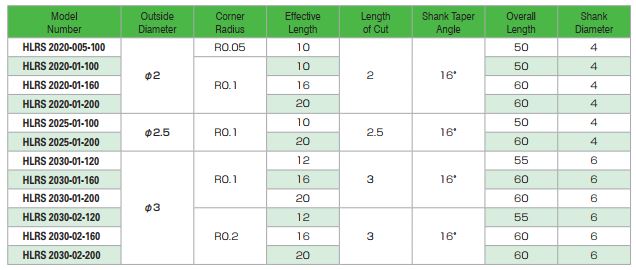 Các sản phẩm bao gồm dao phay ngón hình xuyến và mũi bi cacbua rắn có dung sai bán kính lên đến +/- 0,005 mm và dung sai đường kính 0,01 mm. Dao cắt mũi bi có các đường kính cắt từ 0,4 đến 6 mm. Dao phay ngón Torus có sẵn với đường kính cắt 3 và 4 mm.