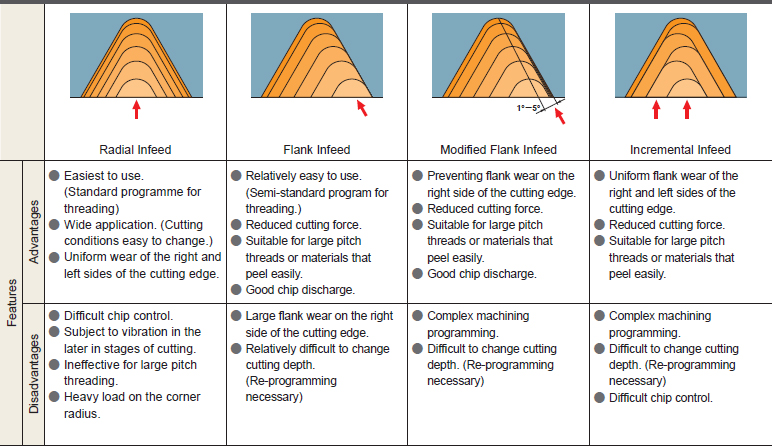 Có thể có ít nhất bốn phương pháp tiến dao. Rất ít người nhận ra mức độ ảnh hưởng của sự lựa chọn giữa các phương pháp này đối với hiệu quả của hoạt động gia công ren.