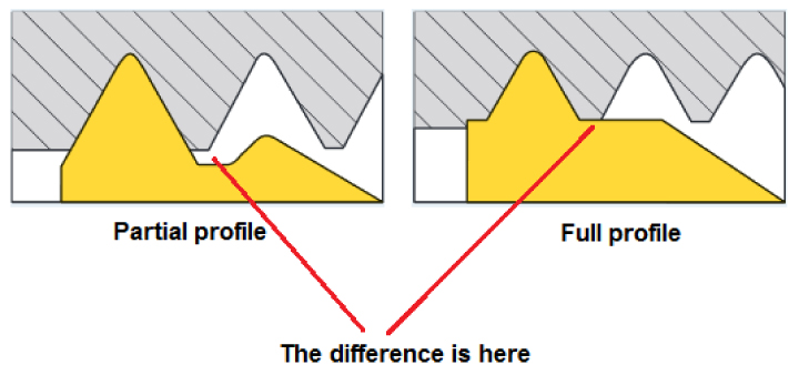 Bán kính mũi dao này được thiết kế đủ nhỏ để insert có thể tạo ra các cao độ khác nhau. Đối với các bước ren nhỏ, bán kính mũi sẽ càng nhỏ hơn . Điều này có nghĩa là insert sẽ phải gia công cắt thâm nhập sâu hơn. Ví dụ, insert ren Partial Profile gia công ren 8TPI yêu cầu độ sâu ren là 0,108 inch, trong khi cùng một quy cách ren được sản xuất với insert Full Profile chỉ yêu cầu độ sâu chỉ định là 0,081 inch. Do đó, sử dụng insert Full Profile gia công được chi tiết ren cứng hơn. Hơn nữa, Insert Full Profile có thể gia công ren ít hơn bốn lần gia công.
