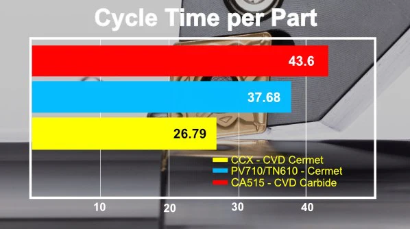 Như bạn có thể nhìn thấy từ biểu đồ bên dưới, Insert CCX - cermet phủ CVD gia công với chu kỳ ngắn hơn do khả năng chạy ở tốc độ cắt cao hơn nhiều so với insert cermet thông thường và insert carbide.