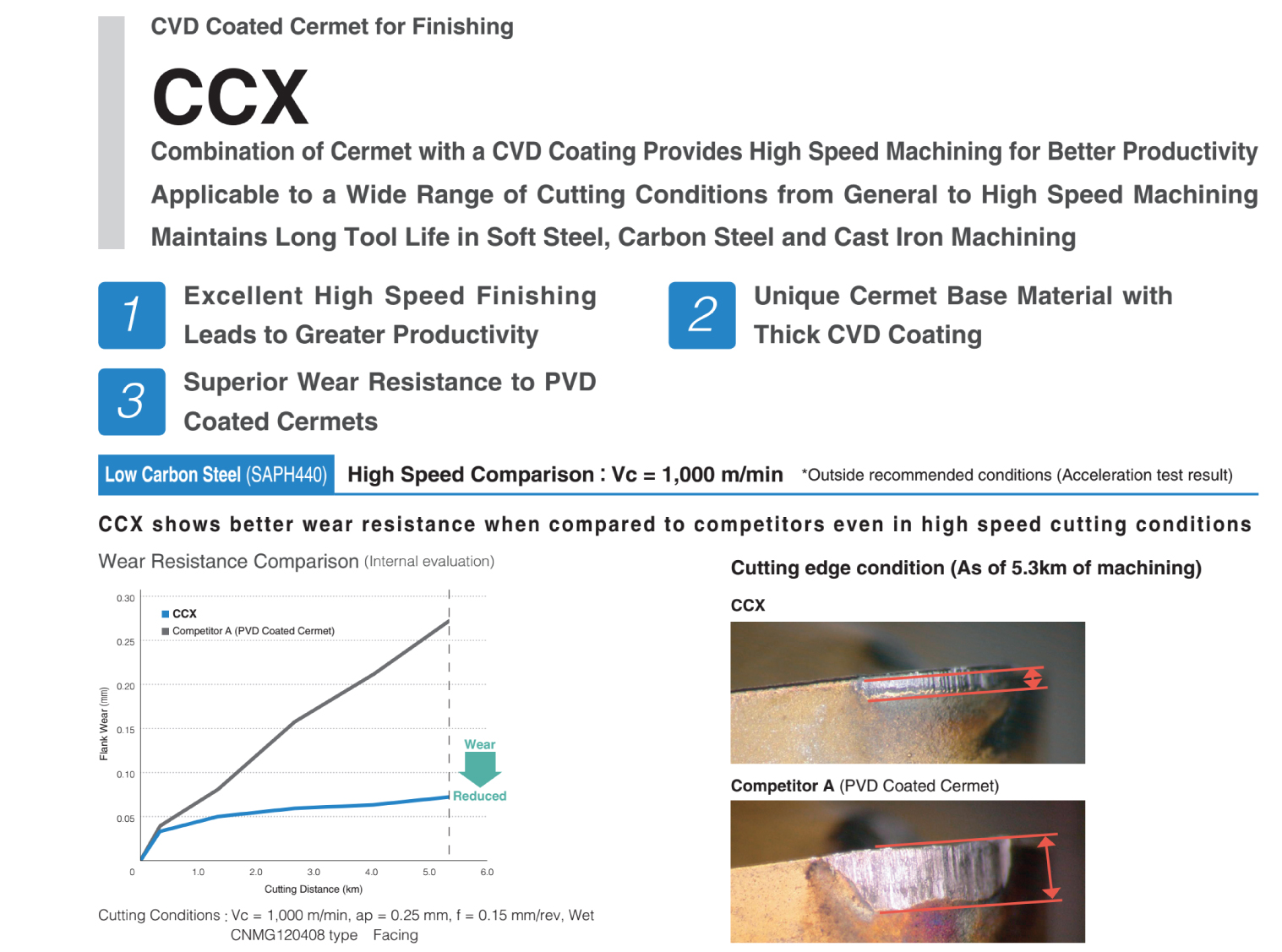 Nếu bạn cần gia tăng năng suất cho quá trình tiện tinh, Insert CCX (Cermet phủ CVD) thiết kế đặc biệt với lớp phủ dày phù hợp gia công high speed, chống mài mòn là lựa chọn phù hợp
