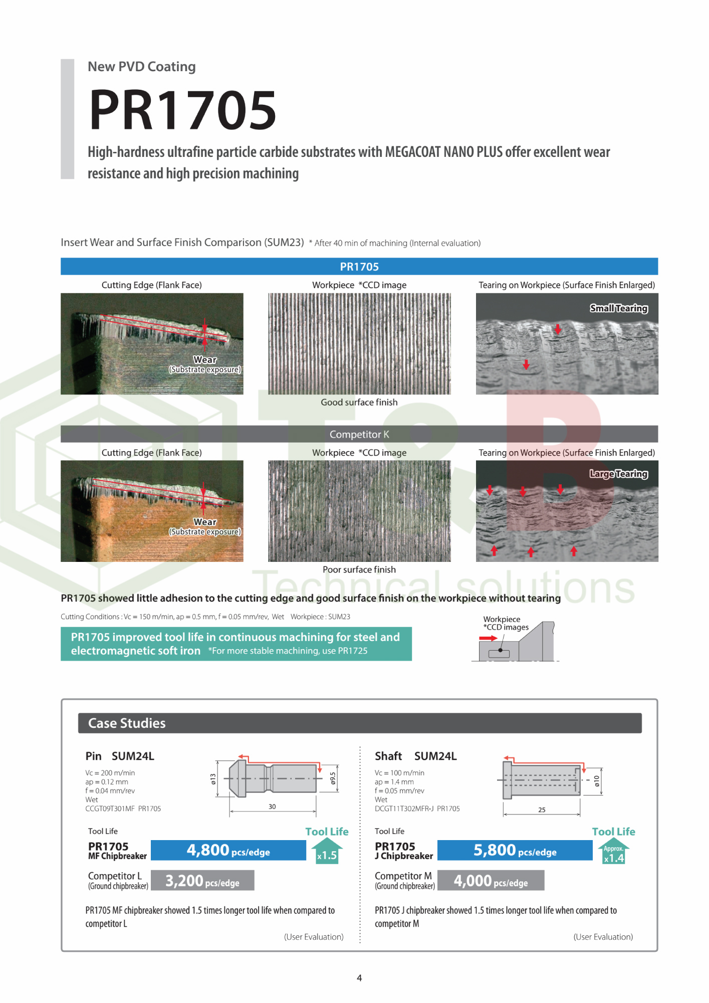 – Lớp phủ PVD PR1705 MEGACOAT NANO PLUS giúp dụng cụ cứng cáp hơn, giảm thiểu sứt mẻ, tránh tình trạng vỡ chip trong quá trình gia công. Qua đó kèo dài tuổi bền của dao cụ, giúp doanh nghiệp giảm chi phí sản xuất, đảm bảo quá trình gia công không bị gián đoạn.
