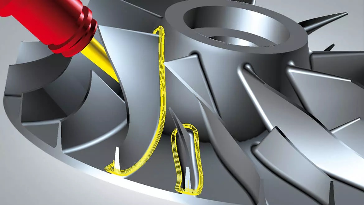 Đây là chiến lược lý tưởng khi bán kính nối giữa moay-ơ và bề mặt cánh thay đổi. Chiến lược này cũng hỗ trợ gia công vét vật liệu còn lại – yếu tố cơ bản để lựa chọn dụng cụ tối ưu cho gia công cánh và moay-ơ.