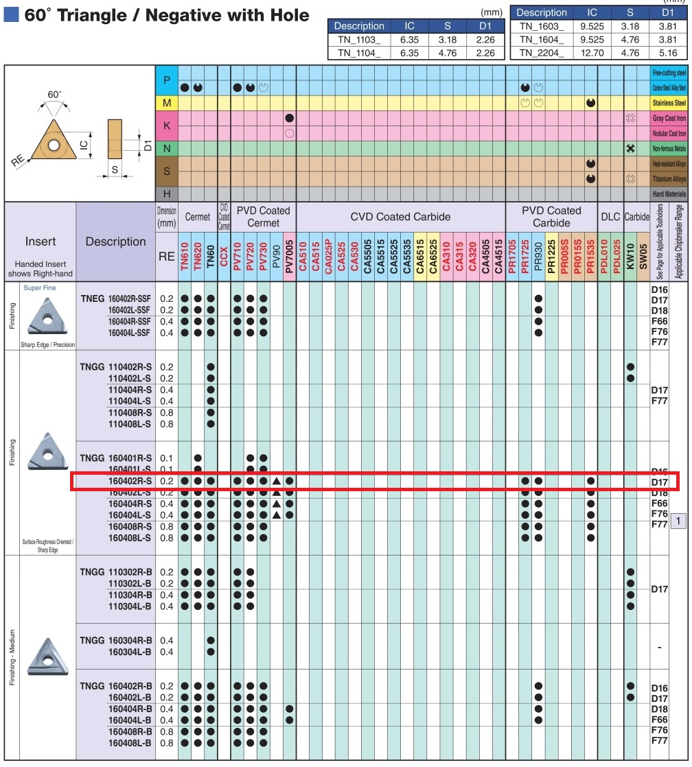 | shape | T (triangle) | Work material | M (stainless steel) [○] / S (heat resistant alloy / titanium alloy) [○] |