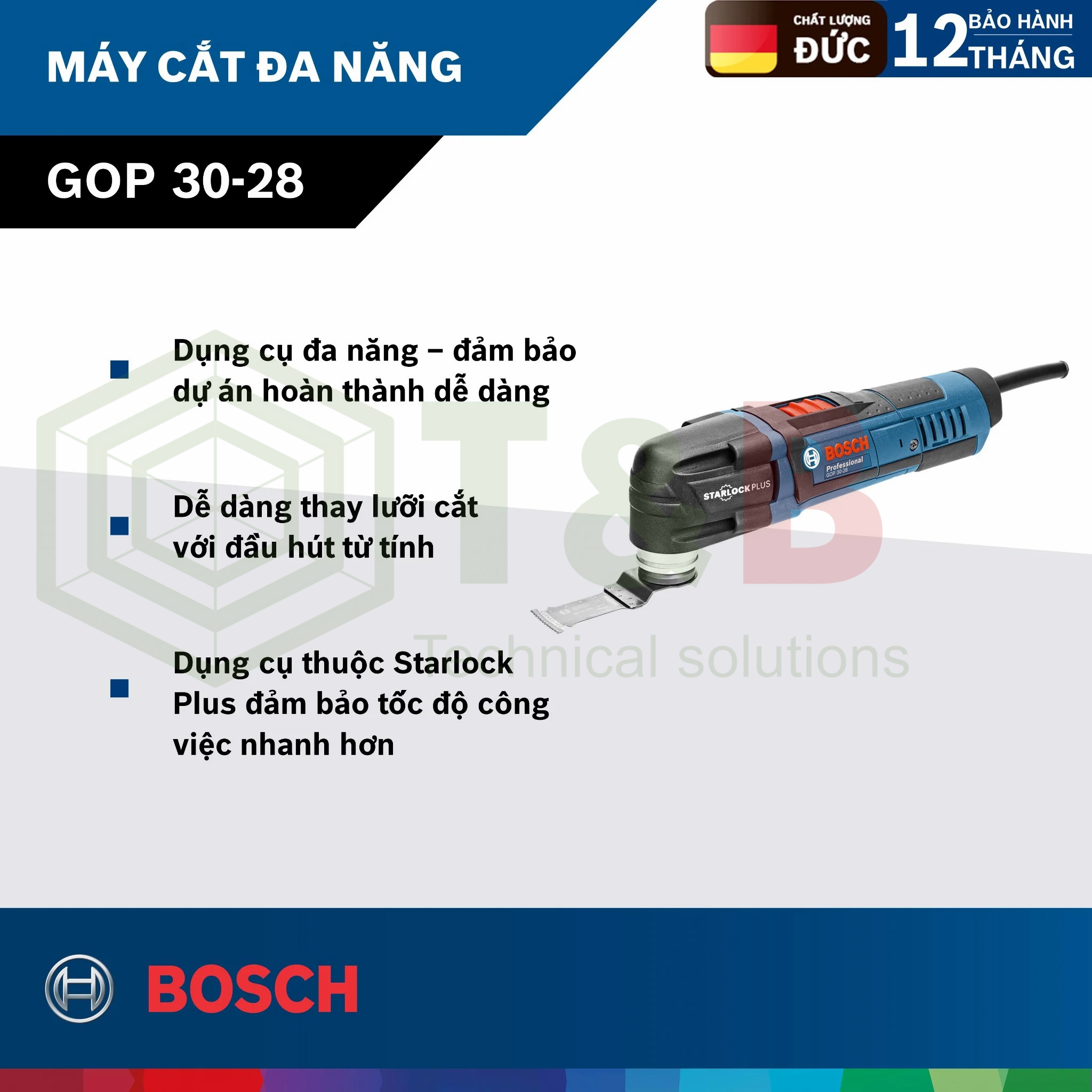 - Máy cắt đa năng Bosch GOP 30-28 Professional được thiết kế để cưa và cắt các nguyên vật liệu bằng gỗ, nhựa, thạch cao, kim loại màu và các chi tiết bắt lắp (vd. đinh, ghim dập chưa tôi). Máy cũng thích hợp để làm việc với gạch ốp lát tường mềm, cũng như sử dụng để chà khô và cạo bề mặt nhỏ. Máy đặc biệt thích hợp để gia công các vị trí cạnh biên và cắt bằng mặt.