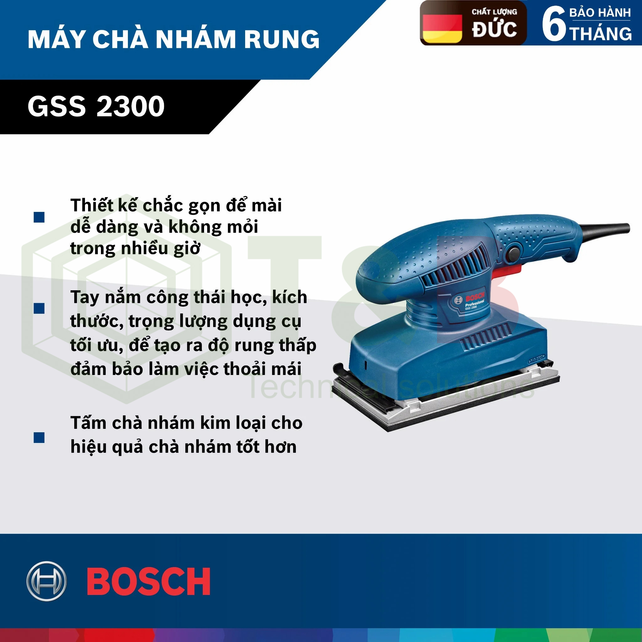 - Máy chà nhám rung Bosch GSS 2300 thường được dùng để chà nhám các bề mặt vật liệu khác nhau, dùng trong cơ khí và các hoạt động xây dựng.