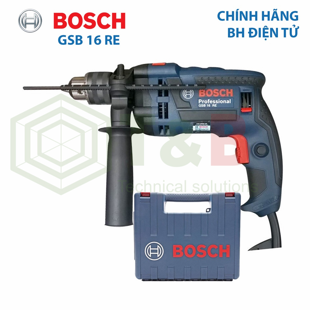- Máy khoan động lực Bosch GSB 16 RE cải tiến hoạt động với công suất tối đa 750 W, có khả năng điều khiển tốc độ điện tử giúp cho máy đạt hiệu suất cao khi làm việc, tiết kiệm thời gian.