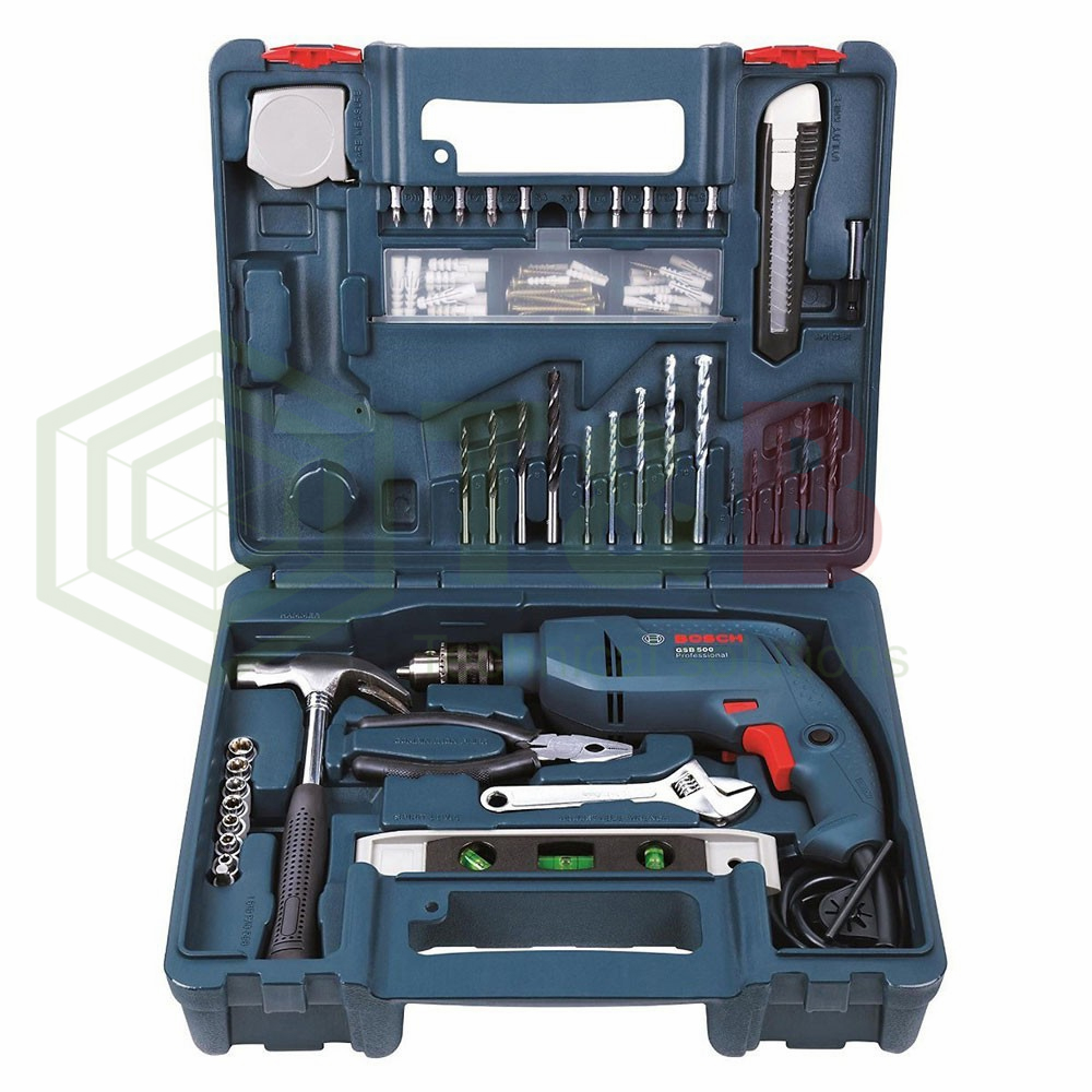 - Được sản xuất và đi kèm cùng với máy khoan động lực BOSCH GSB 550 là nhiều loại vật dụng và thiết bị hỗ trợ đi kèm khác như búa, mỏ lết, kìm cắt, và nhiều loại mũi khoan với kích thước khác nhau ....