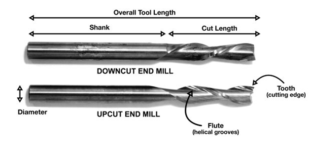Dao phay cũng có các lưỡi cắt là hình xoắn ốc. Nhưng dao phay có thể cắt cả hai bên trục và cắt theo chiều ngang của vật liệu. Điều này là do các me cắt mở rộng ra hai bên và nhô ra từ – mặt cuối cho phép cắt sụt giảm. Để giảm thiểu tình trạng công cụ vỡ và chịu áp lực nặng. Nên hầu hết các phần mềm CNC sẽ thiết kế ăn dao theo mặt nghiêng để dao phay ngón từ từ vào cắt ngang.